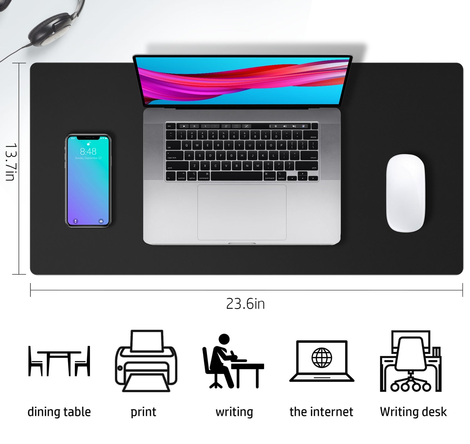31.5 x 15.7 Inch Size is large enough to accommodate your laptop, mouse and keyboard. Its comfortable and smooth surface can be work as a mouse pad, desk mat, desk blotters and writing pad.